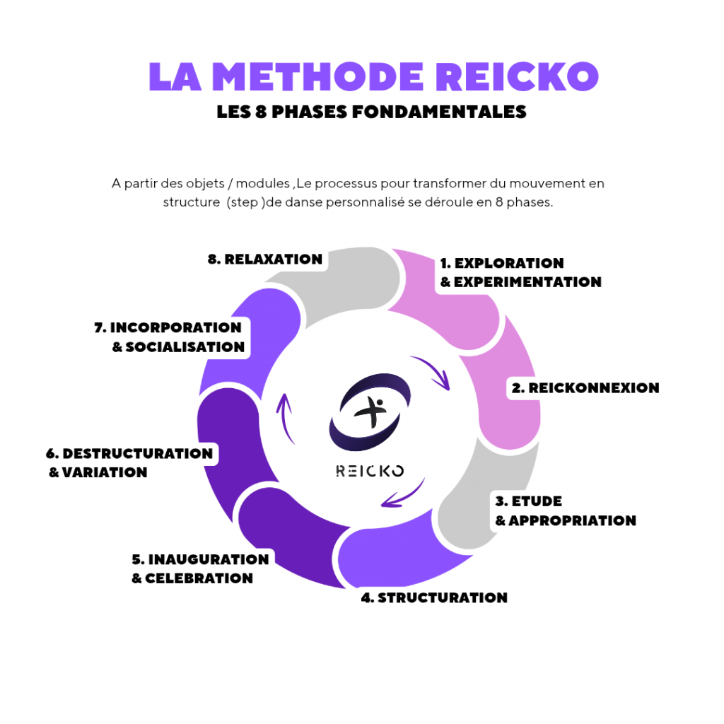 La Méthode REICKO est un processus en 8 étapes qui suit un schéma simple mais puissant : Sensation → Mouvement → Danse.